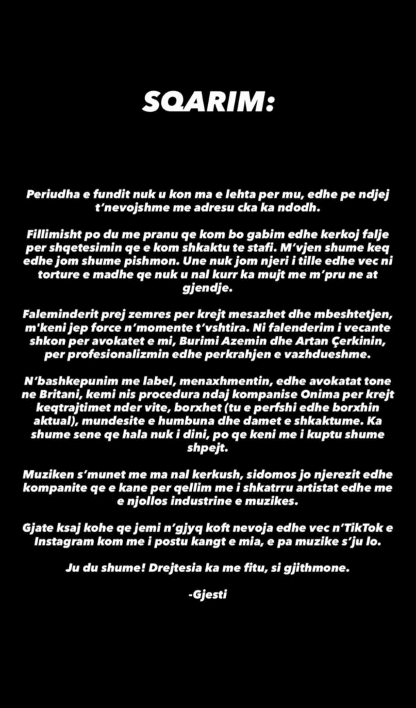Pas një periudhe jo të lehtë, artisti i njohur Gjesti ka vendosur të flasë publikisht për situatën që ka kaluar së fundmi. Ai e nis reagimin duke pranuar gabimin dhe duke kërkuar falje për shqetësimin e shkaktuar ndaj stafit, duke theksuar se nuk është natyrë e tij të veprojë në atë mënyrë dhe se ndihet i penduar për gjithçka që ka ndodhur. Në mesazhin e tij, Gjesti falënderon publikun për mbështetjen e vazhdueshme në momentet e vështira, ndërsa veçon edhe angazhimin e ekipit të tij ligjor për profesionalizmin dhe përkrahjen. Ai zbulon gjithashtu se, në bashkëpunim me partnerët dhe përfaqësuesit ligjorë, kanë nisur procedura ndaj një kompanie për çështje që lidhen me trajtime, detyrime financiare dhe dëme të pretenduara ndër vite. Sipas tij, shumë detaje ende nuk janë bërë publike, por pritet të sqarohen në vijim. Pavarësisht situatës, Gjesti thekson se nuk do të ndalet me muzikën dhe paralajmëron se projektet e tij do të vazhdojnë të publikohen në rrjetet sociale, edhe nëse përkohësisht hasen pengesa. Në fund, ai shprehet i bindur se drejtësia do të vihet në vend. /pasqyrapress/