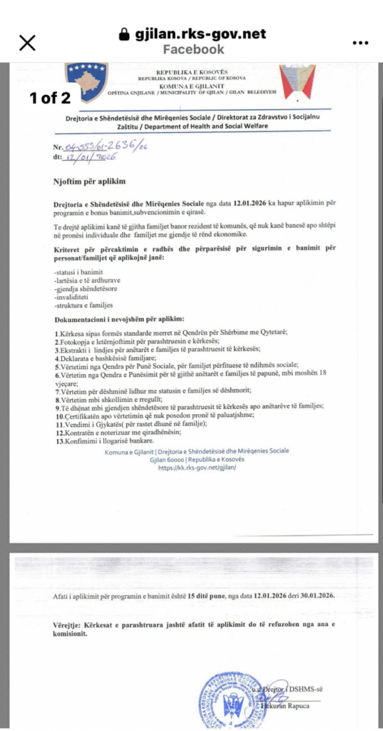 E drejta për aplikim u takon familjeve që jetojnë në Komunën e Gjilanit dhe ndodhen në gjendje të rëndë sociale. Afati për dorëzimin e aplikimeve është 15 ditë pune, nga 12 deri më 30 janar 2026. Aplikimet realizohen pranë Qendrës për Shërbime me Qytetarë, sipas dokumentacionit të kërkuar. Kërkesat e paraqitura pas afatit të caktuar nuk do të merren në shqyrtim. Për informata shtesë, qytetarët mund t’i drejtohen Drejtorisë së Shëndetësisë dhe Mirëqenies Sociale në Komunën e Gjilanit. /PASQYRAPRESS/