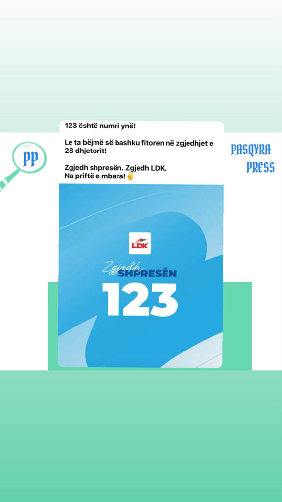 Lidhja Demokratike e Kosovës ka publikuar numrin e saj garues për zgjedhjet e 28 dhjetorit. Fushata është shoqëruar me moton “Zgjedh shpresën”, ndërsa materiali promovues paraqet numrin 123 si simbol të listës së partisë. /Pasqyrapress/