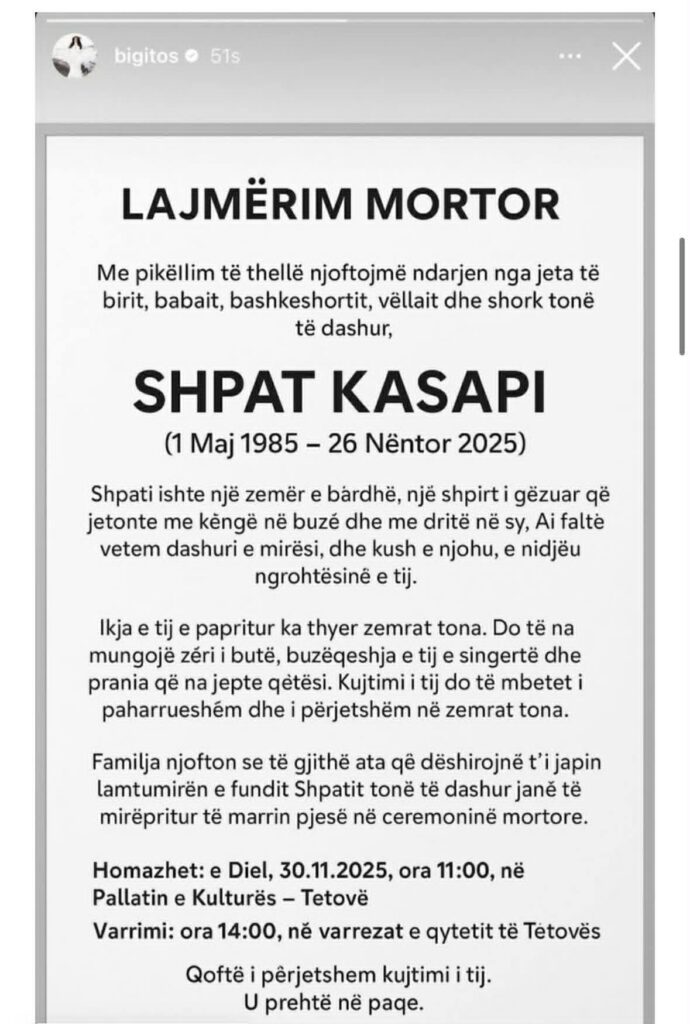 Familja fton të gjithë ata që dëshirojnë t’i japin lamtumirën e fundit të marrin pjesë në ceremoninë mortore. Qoftë i përjetshëm kujtimi i tij. U prehtë në paqe. /Pasqyrapress/.