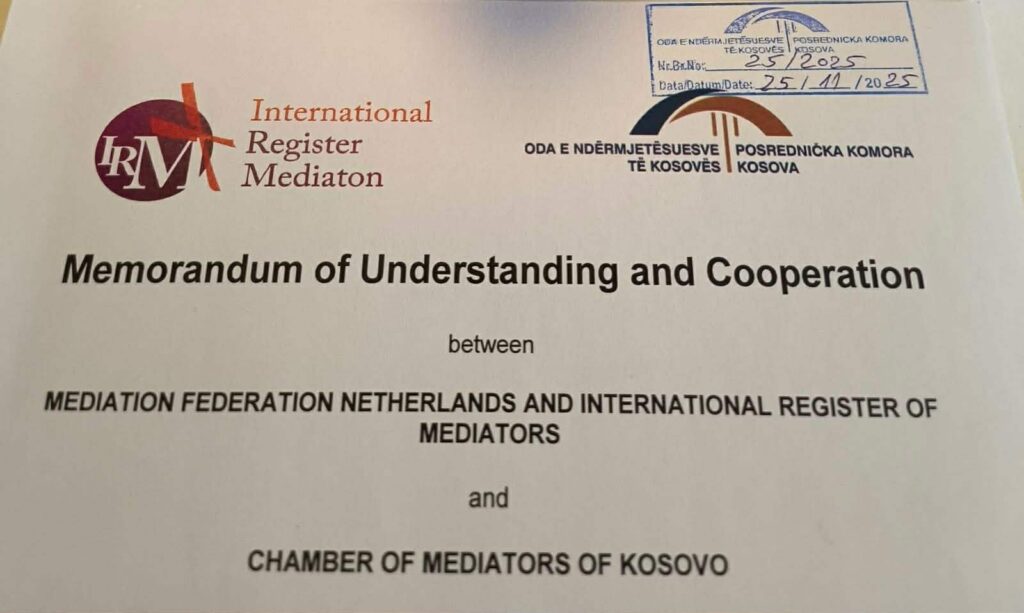 Një hap i ri ndërkombëtar për Odën e Ndërmjetësuesve të Kosovës. Institucioni ka formalizuar bashkëpunimin me Federatën e Ndërmjetësimit të Holandës dhe Regjistrin Ndërkombëtar të Ndërmjetësuesve përmes një Memorandumi të ri, ka njoftuar Oda e Ndermjetesuseve te Kosoves.