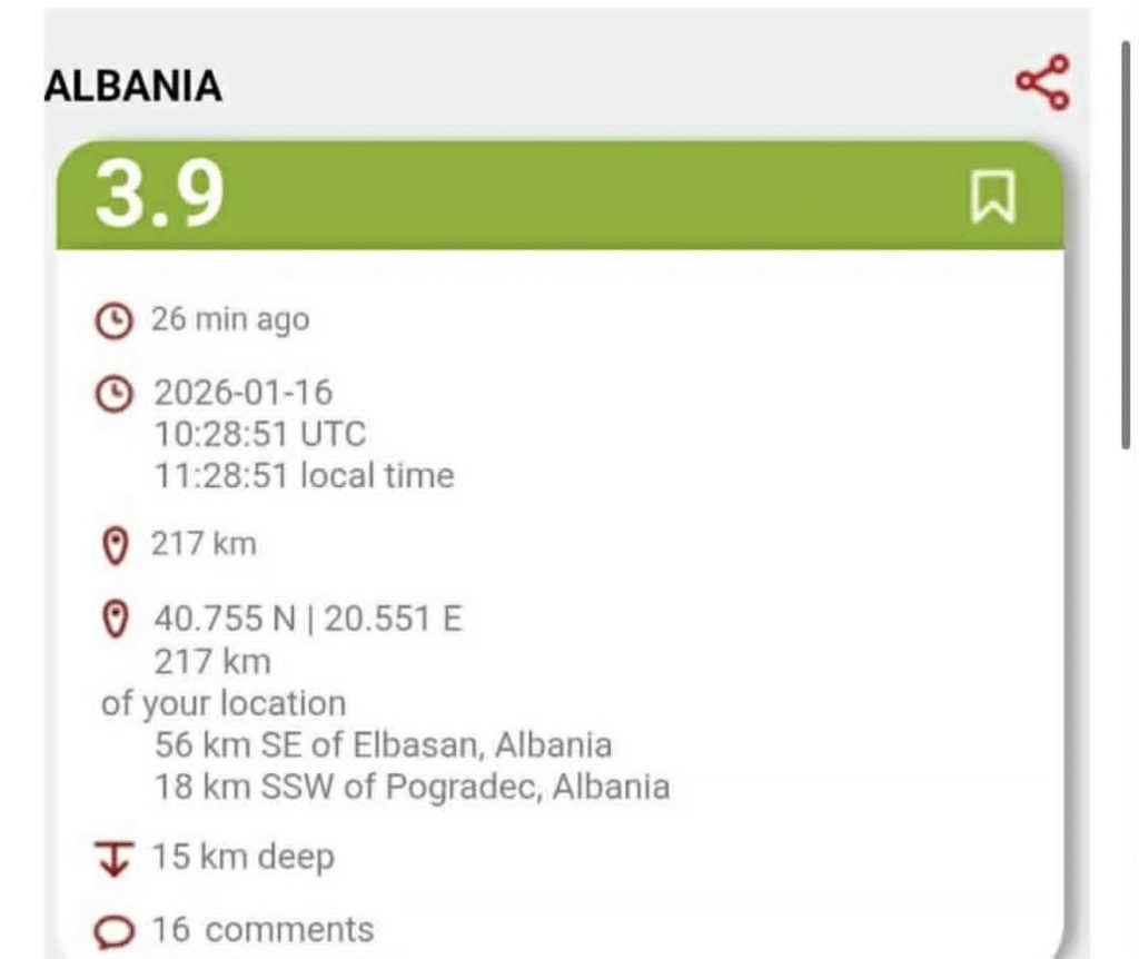 Autoritetet nuk kanë raportuar për pasoja apo dëme nga kjo lëkundje. /pasqyrapress/