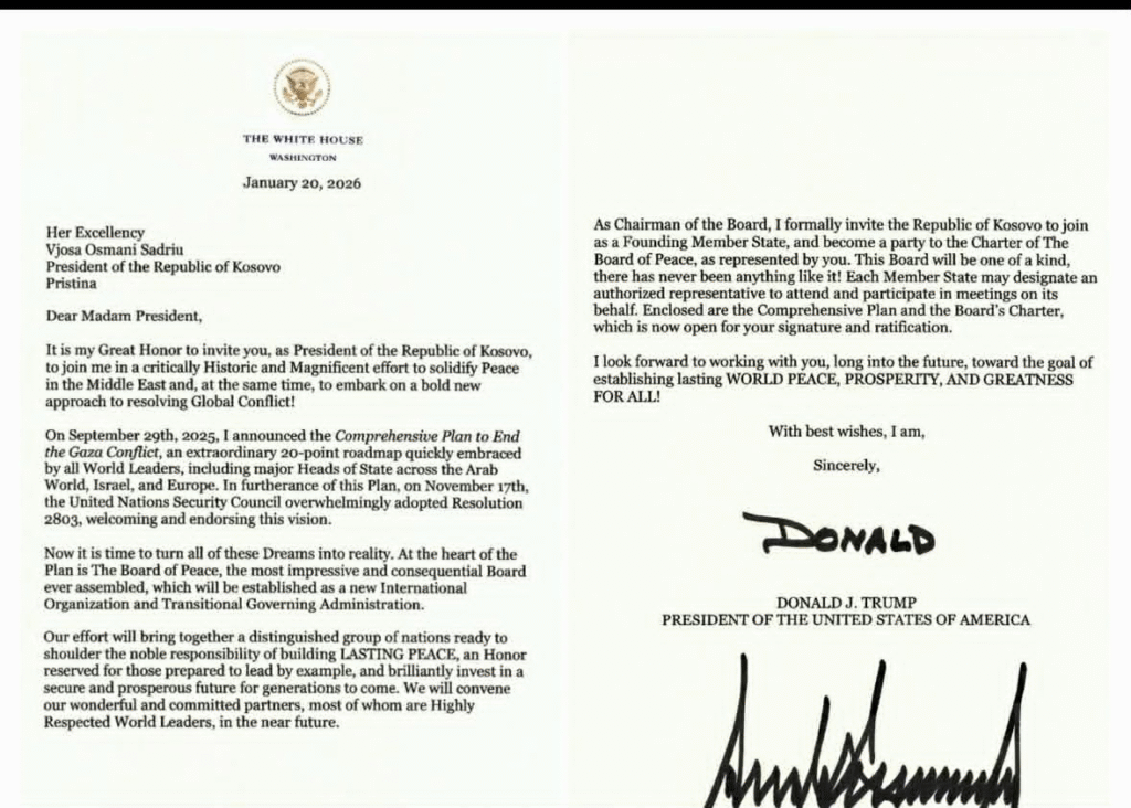 Presidentja e Republikës së Kosovës, Vjosa Osmani, ka bërë të ditur se ka pranuar një ftesë personale nga presidenti amerikan Donald Trump për ta përfaqësuar Kosovën në Bordin e Paqes, si anëtare themeluese e këtij mekanizmi ndërkombëtar. Sipas Osmanit, kjo ftesë vjen në kuadër të një iniciative që synon forcimin e përpjekjeve globale për paqe dhe siguri, ku Kosova do të jetë krah për krah me Shtetet e Bashkuara të Amerikës dhe partnerë të tjerë ndërkombëtarë.
